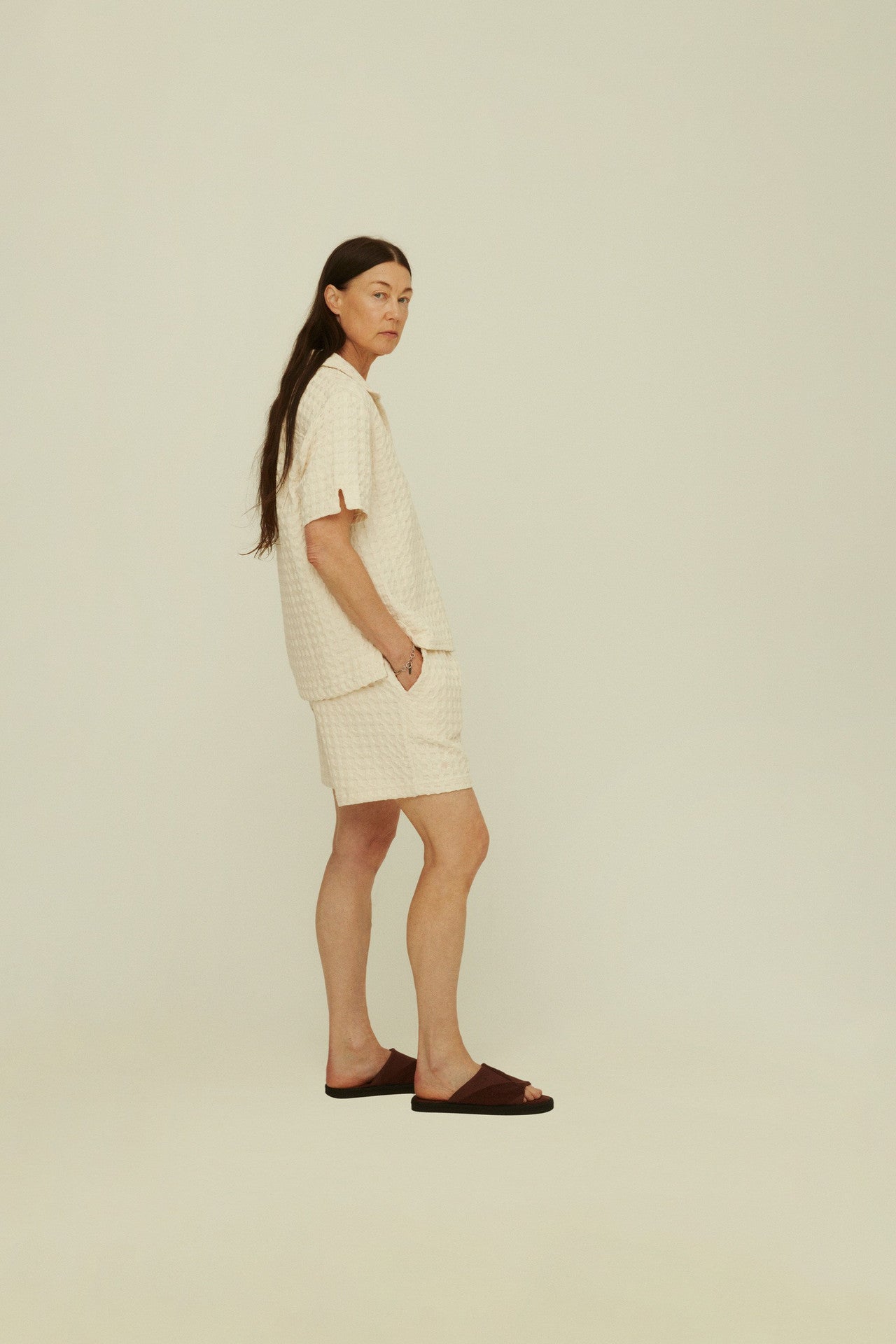 Ecru Jaffa waffle-skjortan är tillverkad i en kraftig, våffestruktur av 100% oblekt bomull som låter din hud andas. Skjortan är konstruerad med en djup sprund, en öppen resortkrage och en rak och ledig passform. Designad i Stockholm och tillverkad i Portugal.