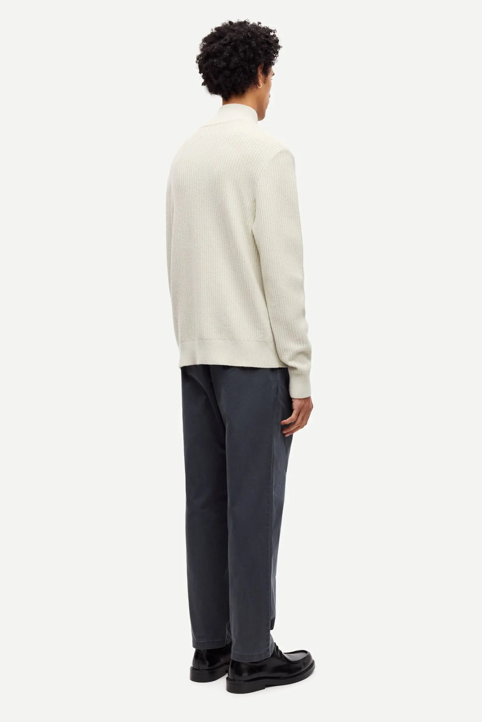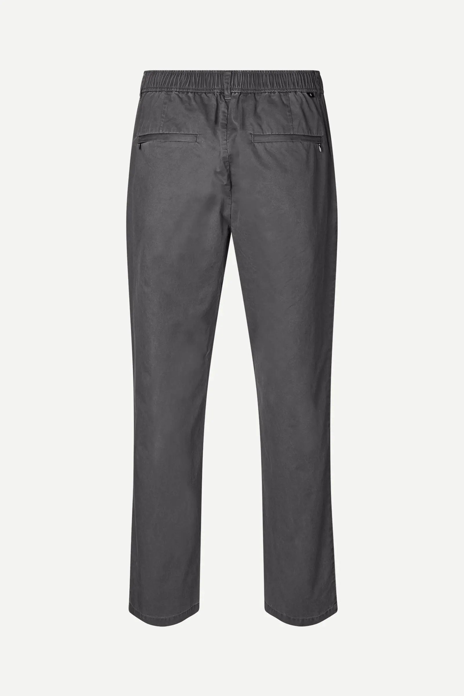 Mid-waist trousers with a regular fit and straight leg. Elasticated waistband with button and zipper closure, drawstring on the inside. Side slit pockets and hidden zipped pocket on the front and welt pockets on the back. Single pleats on the front. Belt loops. Main material made from 100% organic cotton.