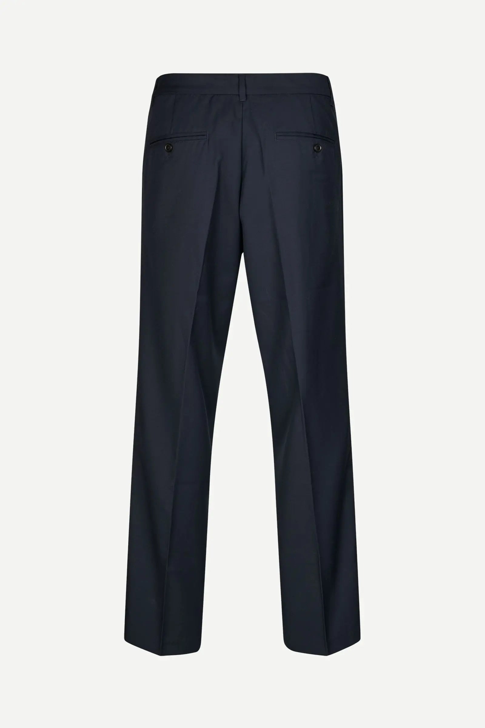 Trousers with a regular fit and wide leg. Button and zipper closure at the fly. Side slit pockets on the front and buttoned welt pockets at the back. Belt loops. Pressed pleats on the front and back. Main material made from a blend of recycled polyester and wool.