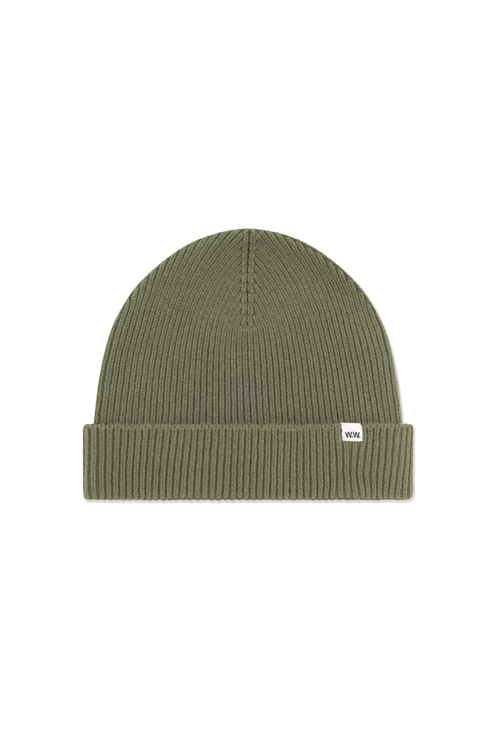 Ribbstickad mössa med uppvikt kant och diskret vävd etikett. Modell med smal, strukturerad passform och tydlig textur.