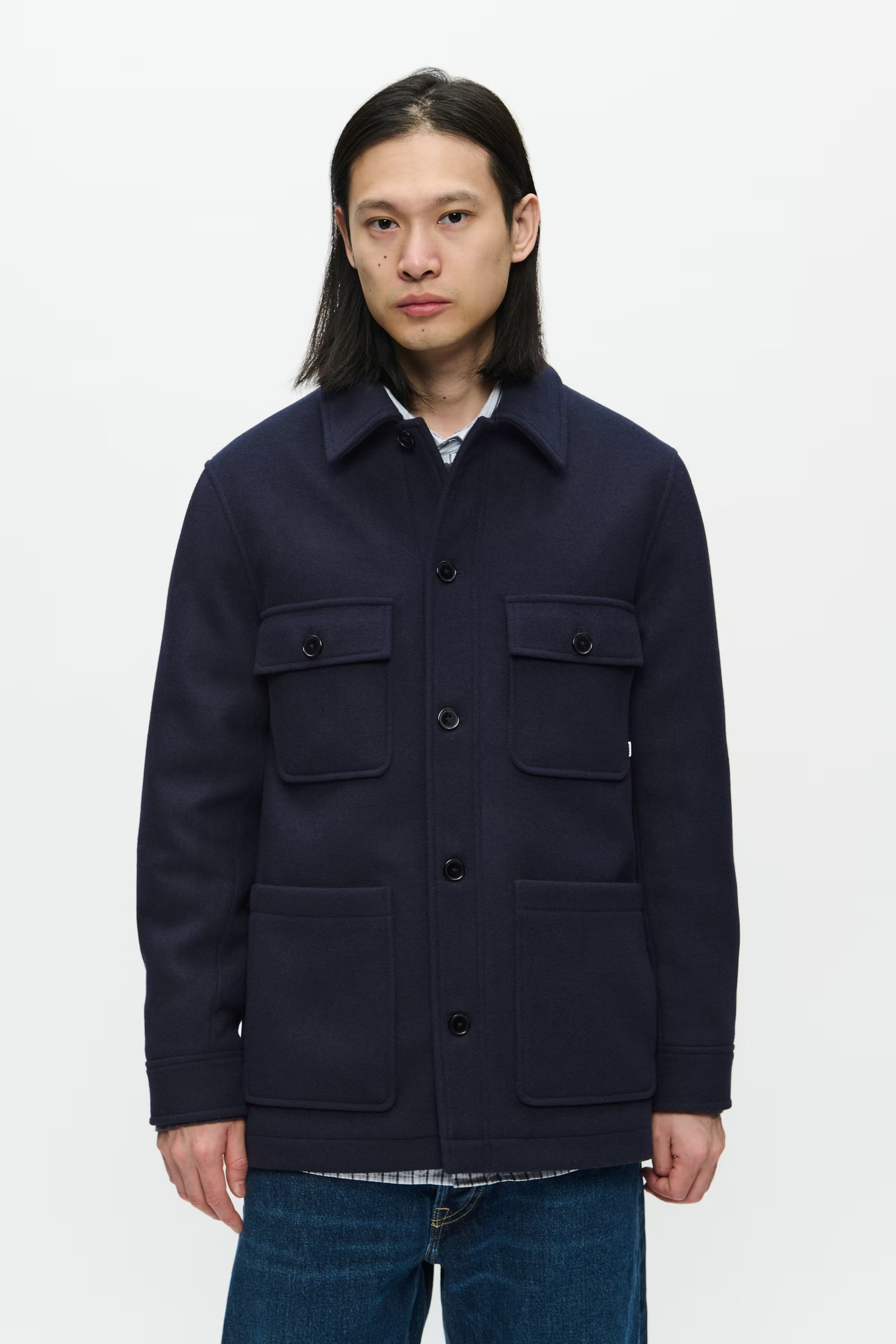 Skjortjacka med rak passform, mjuk yta, klassisk krage och knäppning fram. Fyra stora fickor med lock ger funktionell, självsäker vibe.