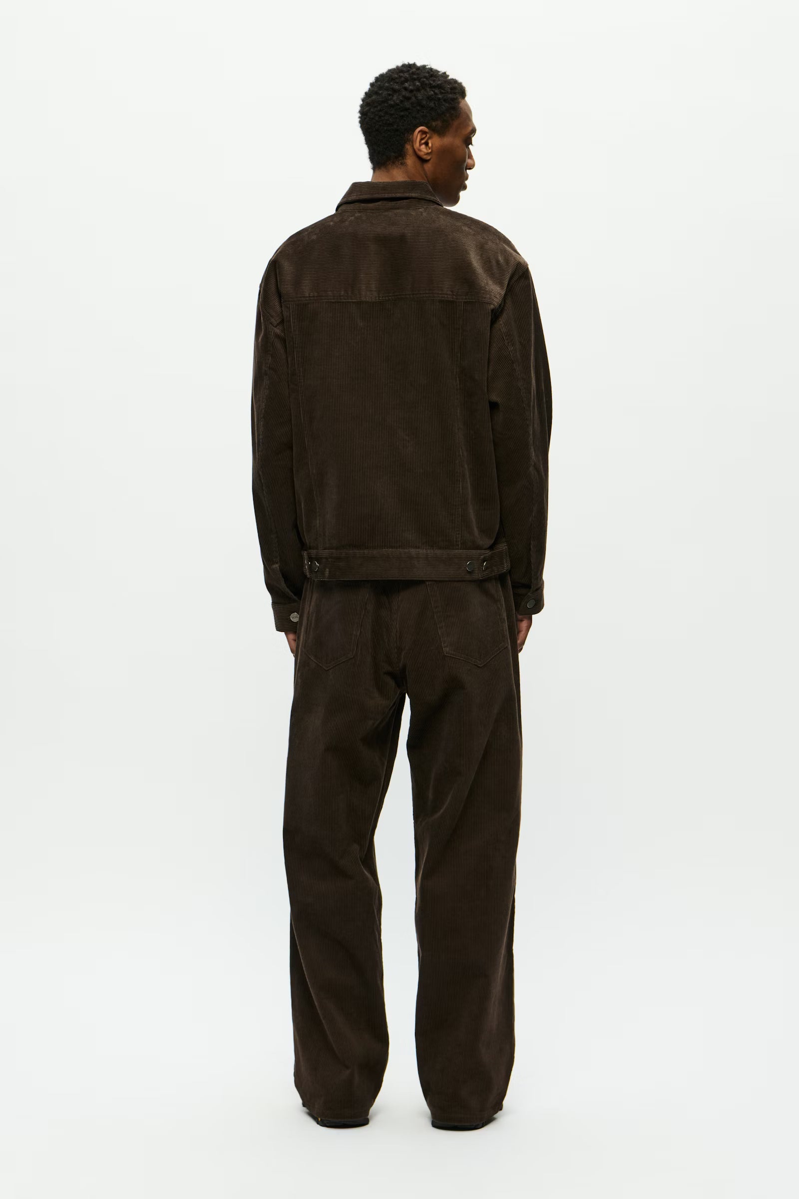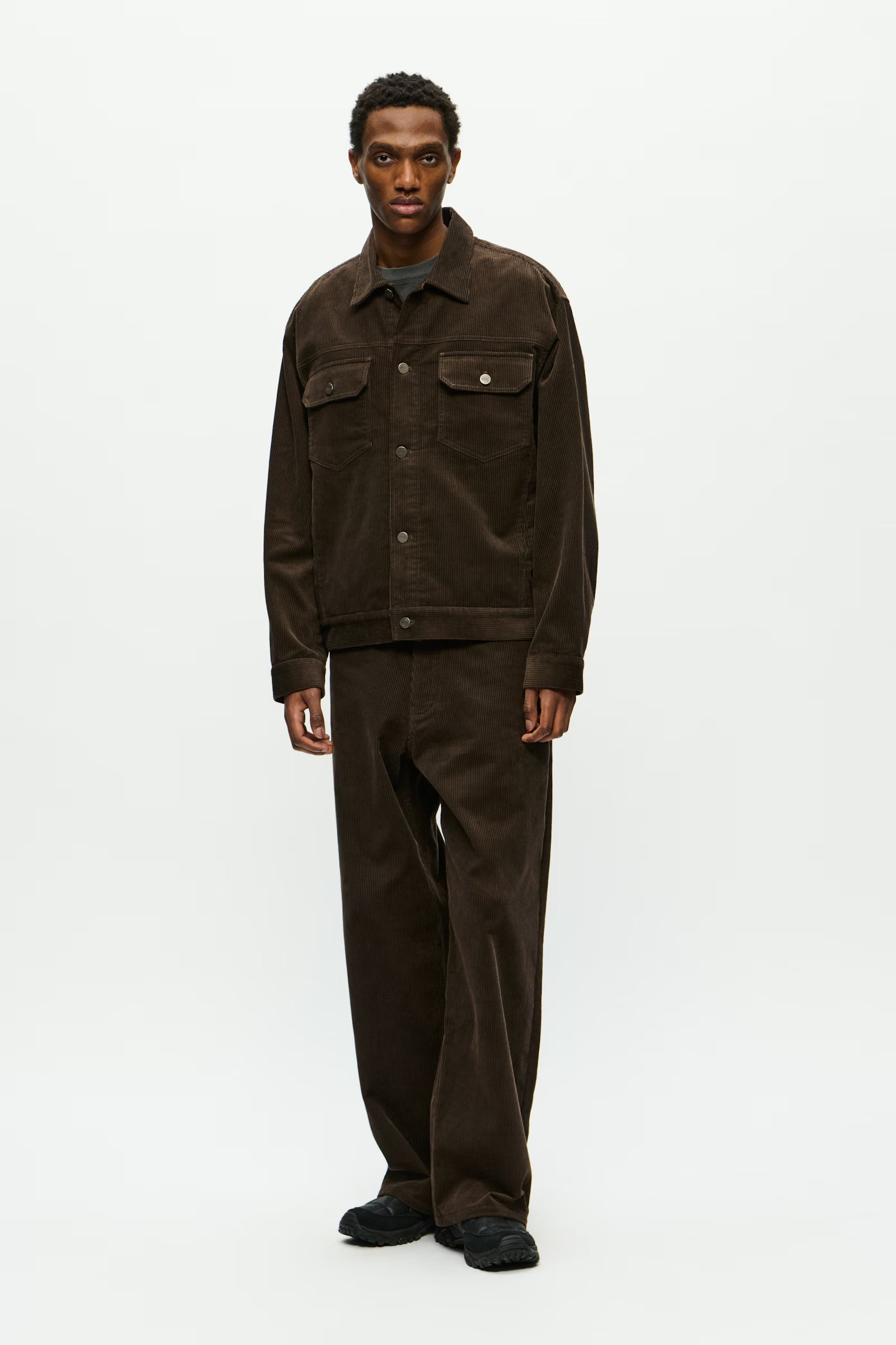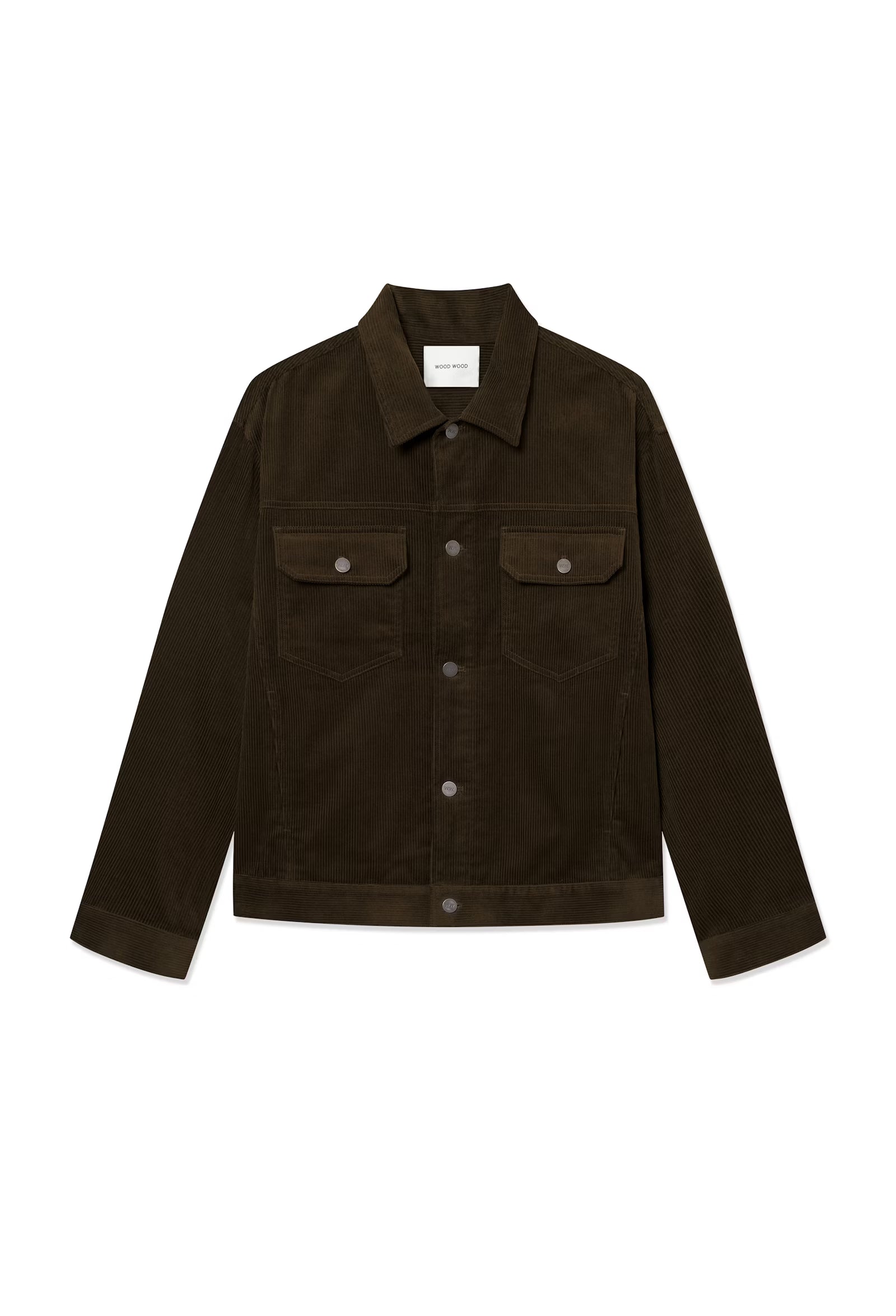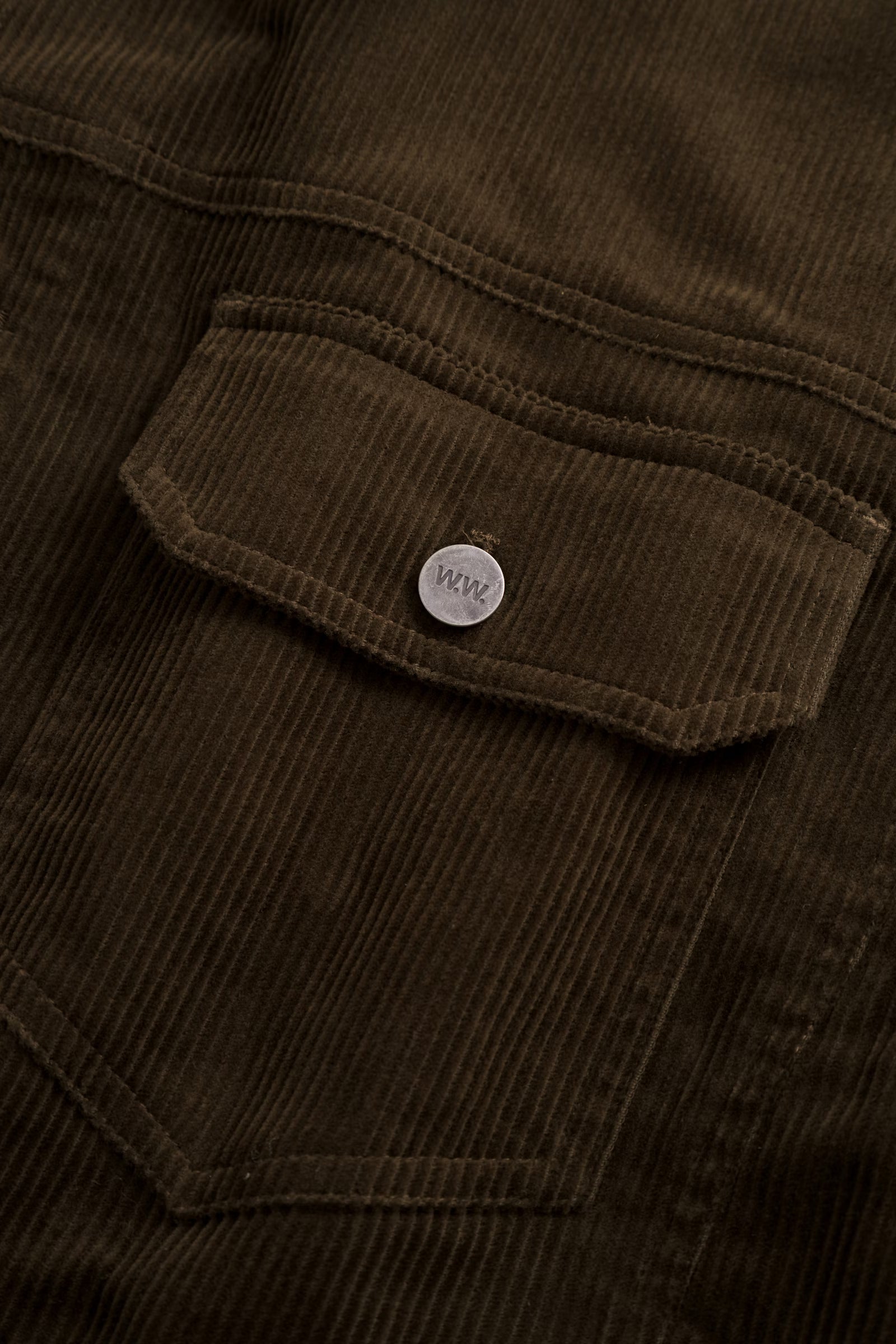 Denna manchesterjacka har rak passform med markerade axlar, mjuk ribbad struktur och knappstängning. Bröstfickor med lock och klassisk krage.